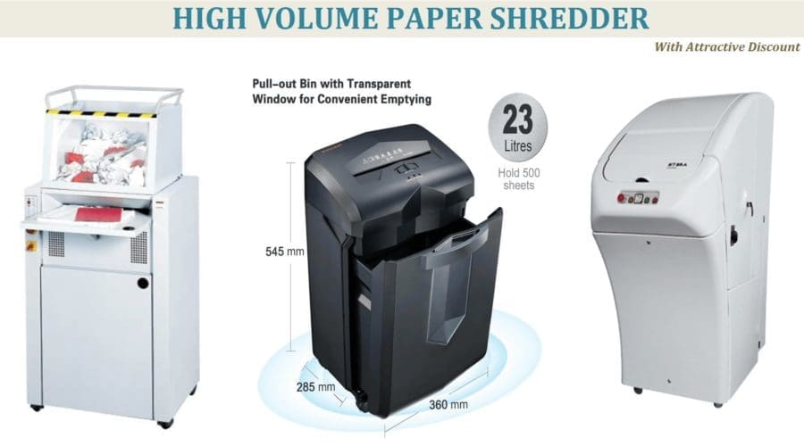 Are you looking for a Paper Shredder to shred Private, Confidential, and legal or otherwise sensitive high volume documents?We have large paper shredders which perform great without any noise or breakdowns. These Shredders easily deal with Private, Confidential, and legal or otherwise sensitive high volume documents without face any problem while shredding.Nowadays Large offices | Industries | Governments | Organization | Business, and Private sector use following shredders.
