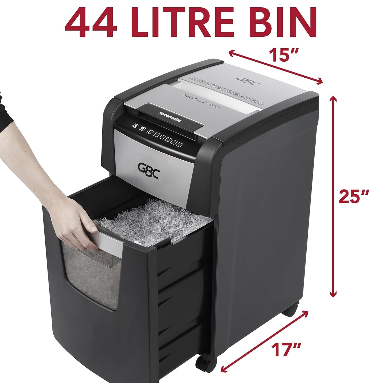 GBC ShredMaster AUTO+ 150M Auto Feed Paper/Credit Card Micro Cut Shredder with 150 Sheet Capacity and 44L Bin for shredding Sensitive documents; 2 x 15 mm Micro Cut Strips