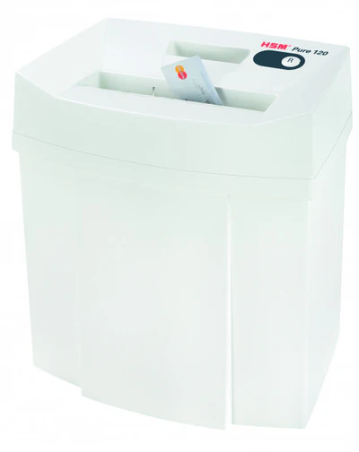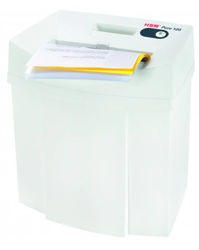 HSM Pure 120c is a cross cut paper shredder with a P-4 security level for top-notch data protection in Small & Home Offices. The multiuser shredder enables up to 3 users to shred around 7 sheets of paper, paper clips, staples, credit cards, and CDs & DVDs in a single sitting.