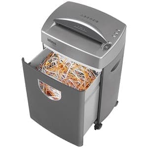 Shreds paper, credit cards and CDs. Dustproof collecting bin with inspection window. Easy emptying thanks to removable bin. Easy mobility thanks to 4 castors – 2 lockable. Shreds paper clips, CD/DVD and plastic cards.